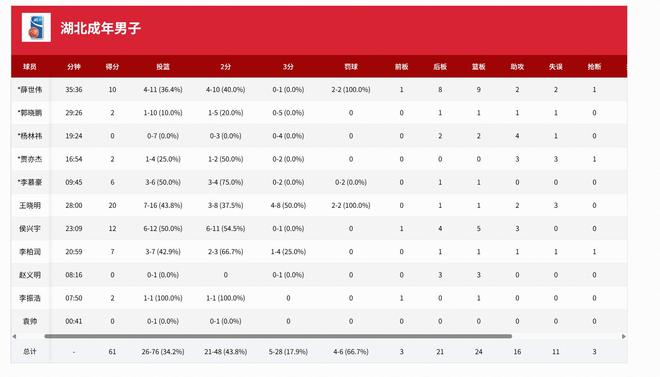 湖北男篮:王晓明20分1板2助、侯兴宇12分5板3助、薛世伟10分8板2助、李柏润7分1助、李慕豪6分1板;