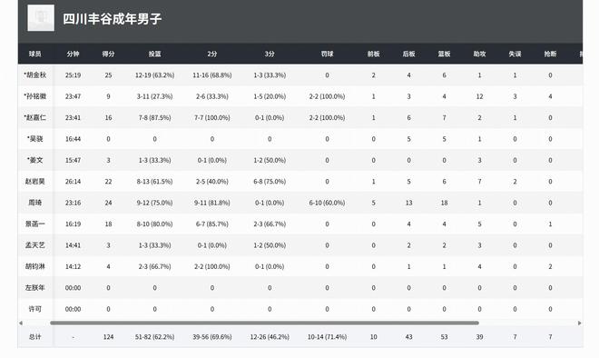 四川男篮:胡金秋25分6板1助3帽、周琦24分18板1助、赵岩昊22分6板7助、景菡一18分3板3助、赵嘉仁16分6板2助2帽、孙铭徽9分4板12助4断。